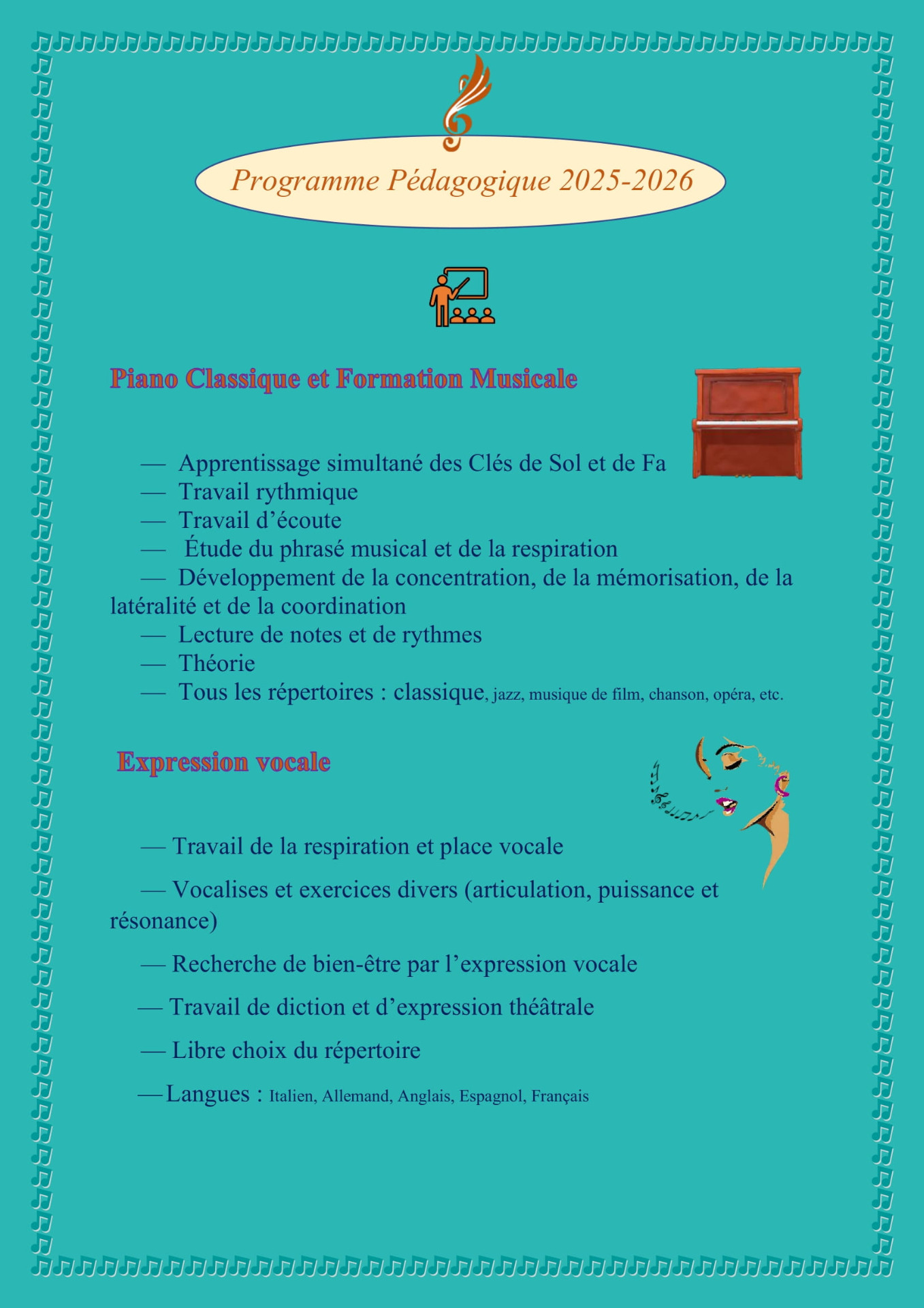 Enfin, cette pratique développe grandement l'écoute. Cette dernière sera utile pour progresser instrumentalement, mais elle permettra en outre une audition plus fine des accents et des intonations, précieuse pour l'étude des langues étrangères !